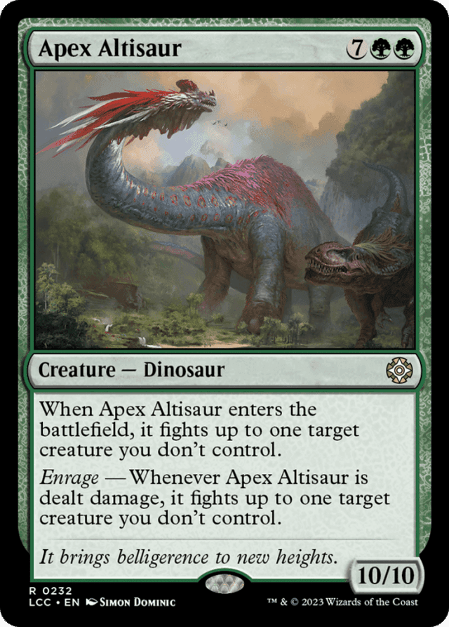 If Apex Altisaur fights a creature while either of its abilities is resolving, being dealt damage this way causes its second ability to trigger. It may fight several times in a row this way. — If the target creature is an illegal target when Apex Altisaur's last ability tries to resolve, the ability doesn't resolve. If it's a legal target but Apex Altisaur is no longer on the battlefield when the ability resolves (perhaps because it has already died from picking too many fights) the target creature won't deal or be dealt damage.