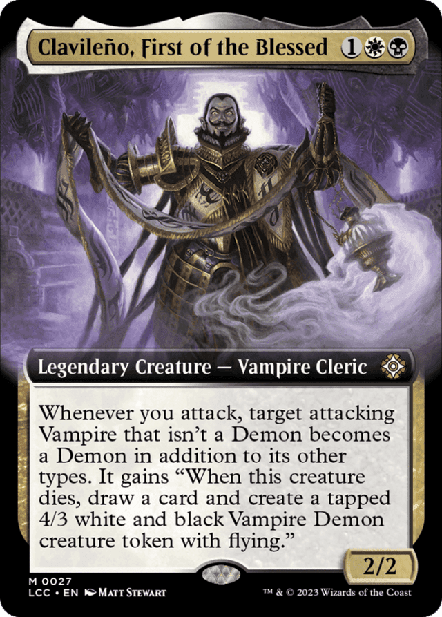 Whenever you attack, target attacking Vampire that isn't a Demon becomes a Demon in addition to its other types. It gains "When this creature dies, draw a card and create a tapped 4/3 white and black Vampire Demon creature token with flying."