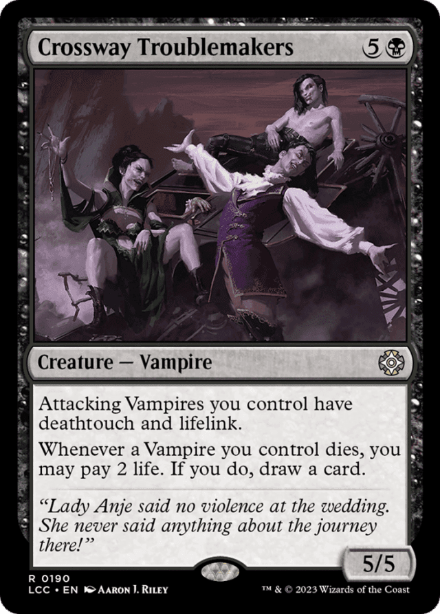 Attacking Vampires you control have deathtouch and lifelink. (Any amount of damage they deal to a creature is enough to destroy it. Damage dealt by those creatures also causes their controller to gain that much life.) Whenever a Vampire you control dies, you may pay 2 life. If you do, draw a card.