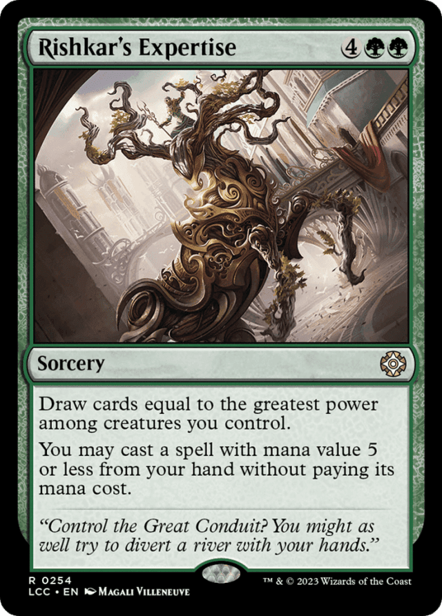 A card's mana value is determined solely by the mana symbols printed in its upper right corner. The mana value is the total amount of mana in that cost, regardless of color. For example, a card with mana cost {1}{U}{U} has mana value 3. Ignore any alternative costs, additional costs, cost increases, or cost reductions that could apply to it. A card with no mana cost has a mana value of 0. — Any triggered abilities that trigger while performing the Expertise spell's first effect won't be put onto the stack until after you're done casting your free spell. They're put onto the stack at the same time as any abilities that triggered while casting that spell regardless of the order in which those abilities triggered. — Effects that allow you to "cast" a card don't allow you to play a land card. — If the card has {X} in its mana cost, you must choose 0 as the value of X when casting it without paying its mana cost. — If you cast a card "without paying its mana cost," you can't choose to cast it for any alternative costs, such as emerge costs. You can, however, pay additional costs. If the card has any mandatory additional costs, such as that of Cathartic Reunion, you must pay those to cast the card. — If you control no creatures with power greater than 0 as Rishkar's Expertise resolves, you draw no cards, but you may cast a card with mana value 5 or less from your hand without paying its mana cost. — The greatest power among creatures you control is determined as Rishkar's Expertise resolves. — While you're casting your free spell, the Expertise spell is still on the stack. It will be put into its owner's graveyard after the free spell is cast. The free spell can't target the Expertise card in your graveyard. It can target the Expertise spell on the stack, but the Expertise spell will become an illegal target before the free spell resolves. — You may cast one of the cards drawn by Rishkar's Expertise's first effect while performing its second effect. — The mana value of a split card is determined by the combined mana cost of its two halves. If an expertise spell allows you to cast a split card, you may cast either half or, if that split card has fuse, both halves.