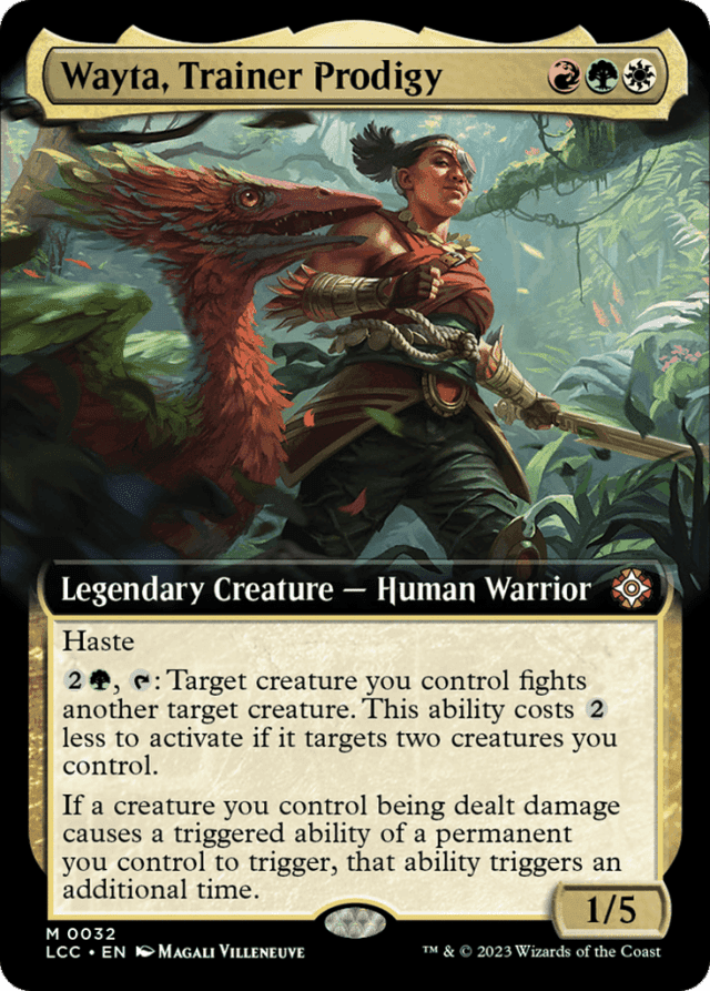 If you somehow control two copies of Wayta, Trainer Prodigy, a creature you control being dealt damage causes abilities to trigger three times, not four. A third Wayta, Trainer Prodigy causes abilities to trigger four times, a fourth causes abilities to trigger five times, and so on. — Wayta, Trainer Prodigy's last ability affects only triggered abilities whose trigger conditions refer specifically to damage being dealt, such as the ability granted by Mephidross Vampire or the last ability of Wrathful Raptors. It does not affect triggered abilities that would trigger because of the results of that damage. For example, if you control an Ajani's Pridemate ("Whenever you gain life, put a +1/+1 counter on Ajani's Pridemate") and you activate Wayta, Trainer Prodigy's second ability targeting a creature you control with lifelink and another creature you control, the triggered ability of Ajani's Pridemate will still trigger only once. — Wayta, Trainer Prodigy's last ability doesn't copy the triggered ability; it just causes the ability to trigger twice. Any choices made as you put the ability onto the stack, such as modes and targets, are made separately for each instance of the ability. Any choices made on resolution, such as whether to put counters on a permanent, are also made individually.
