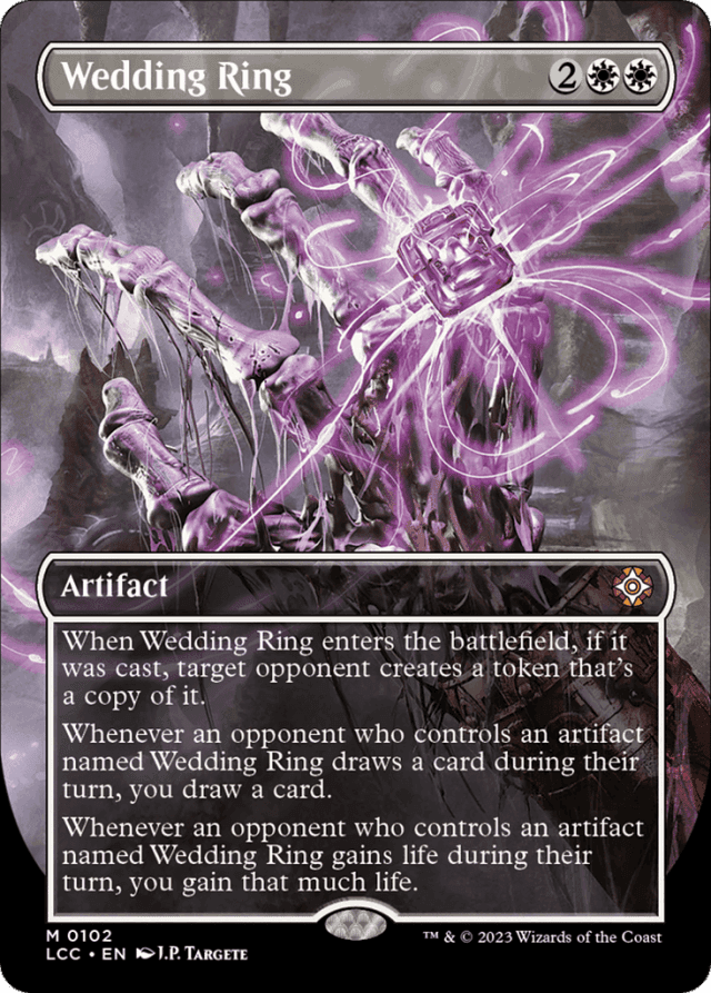 When this artifact enters, if it was cast, target opponent creates a token that's a copy of it. Whenever an opponent who controls an artifact named Wedding Ring draws a card during their turn, you draw a card. Whenever an opponent who controls an artifact named Wedding Ring gains life during their turn, you gain that much life.