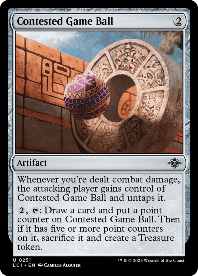 Contested Game Ball's triggered ability triggers only once whenever you're dealt combat damage, no matter how many creatures deal combat damage to you at the same time. — If point counters are put on Contested Game Ball some way other than its last ability, you won't sacrifice it or create a Treasure token. The check for five or more point counters happens only as the activated ability resolves. — In a Two-Headed Giant game, each player on the attacking team is an attacking player. When Contested Game Ball's first ability resolves, you'll choose which member of the attacking team gains control of it.
