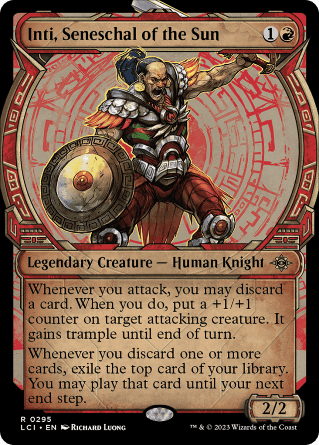 Whenever you attack, you may discard a card. When you do, put a +1/+1 counter on target attacking creature. It gains trample until end of turn. Whenever you discard one or more cards, exile the top card of your library. You may play that card until your next end step.