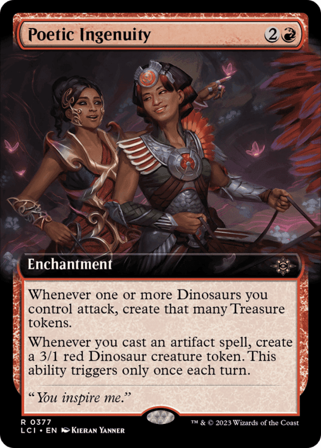 Whenever one or more Dinosaurs you control attack, create that many Treasure tokens. Whenever you cast an artifact spell, create a 3/1 red Dinosaur creature token. This ability triggers only once each turn.