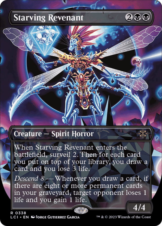 Cards with the ability word "descend N" have abilities that care if you have at least N permanent cards in your graveyard. — Except in some unusual cases, the cards you put on top of your library while surveilling will be the cards you draw. — For Starving Revenant's enters-the-battlefield ability, you put cards into your graveyard for surveil (if any) before drawing cards. If there are eight or more permanent cards in your graveyard by the time you draw cards, those draws will cause the descend 8 ability to trigger. — Some descend triggered abilities include intervening "if" clauses (i.e. "if you have [four or eight] permanent cards in your graveyard" in the middle of the ability). Each of these abilities checks your graveyard at the moment it would trigger to see if it does. If you don't have the required number of permanent cards in your graveyard at that time, the ability doesn't trigger at all. If it does trigger, it will check again as it tries to resolve. If you don't have the required number of permanent cards in your graveyard at that time, the ability won't resolve and none of its effects will happen. — When you surveil, you may put all the cards you look at back on top of your library, you may put all of those cards into your graveyard, or you may put some of those cards on top and the rest of them into your graveyard.