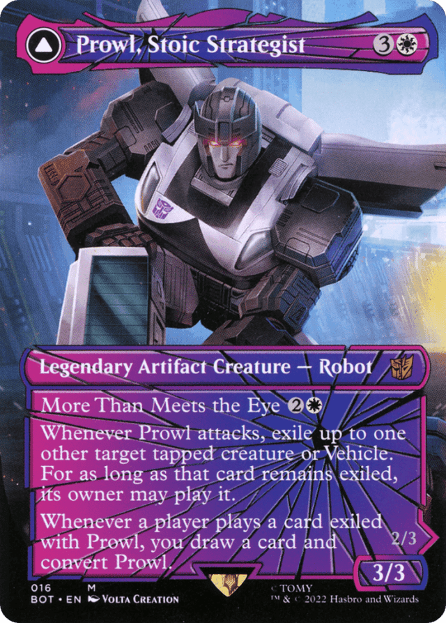 "Living metal" means "As long as it's your turn, this permanent is an artifact creature in addition to its other types." — "More Than Meets the Eye [cost]" means "You may cast this card converted by paying [cost] rather than its mana cost." It functions in any zone from which the spell can be cast. — A spell cast this way enters the battlefield with its back face up. — Any triggered ability of another card that triggers whenever a permanent transforms will also trigger whenever a permanent converts. — Converting a permanent doesn't affect any Auras or Equipment that are attached to it. Similarly, any counters on the permanent will remain on that permanent after it converts. Any continuous effects from a resolved spell or ability will continue to affect it. Any spells or abilities on the stack that target a permanent continue to do so after that permanent converts. — If a static ability of another permanent applies only to noncreature permanents, that ability applies to a Vehicle with living metal only during your opponents' turns. For example, if you control Arcee, Acrobatic Coupe and March of the Machines, Arcee will be a 2/2 artifact creature during your turn and a 3/3 artifact creature (because its mana value is 3) during each opponent's turn. — If you copy a permanent spell cast this way, the copy has the characteristics of the card's back face, even though it isn't itself a double-faced card. — Players must pay all costs and follow all normal timing rules to play cards they own that were exiled by Prowl, Stoic Strategist. — Similarly, an ability of another card that instructs you to "transform" one of these cards will cause you to convert it, even if that ability doesn't use the word "convert." — The convert keyword action functions the same way as the transform keyword action found on some other cards; to convert a permanent on the battlefield, turn it over so that its other face is up. — The cost is an alternative cost, so it can't be combined with any other alternative costs. It can be combined with any applicable additional costs. — The exiled cards' owners may play them for as long as they remain exiled, but the triggered ability that causes you to draw a card will trigger only if Prowl is still on the battlefield as Prowl, Stoic Strategist. — The mana value of a converted permanent on the battlefield is equal to the mana value of the card's front face, no matter which face is up. — To determine the total cost of a spell, start with the mana cost or alternative cost (such as a More Than Meets the Eye cost) you're paying, add any cost increases, then apply any cost reductions. The mana value of a spell cast using More Than Meets the Eye is determined by the mana cost on the front face of the card, no matter what the total cost to cast the spell was. — When you cast a spell using its More Than Meets the Eye ability, the card is put onto the stack with its back face up. The resulting spell has all characteristics of that face. — While it's a creature, the Vehicle has its printed power and toughness.