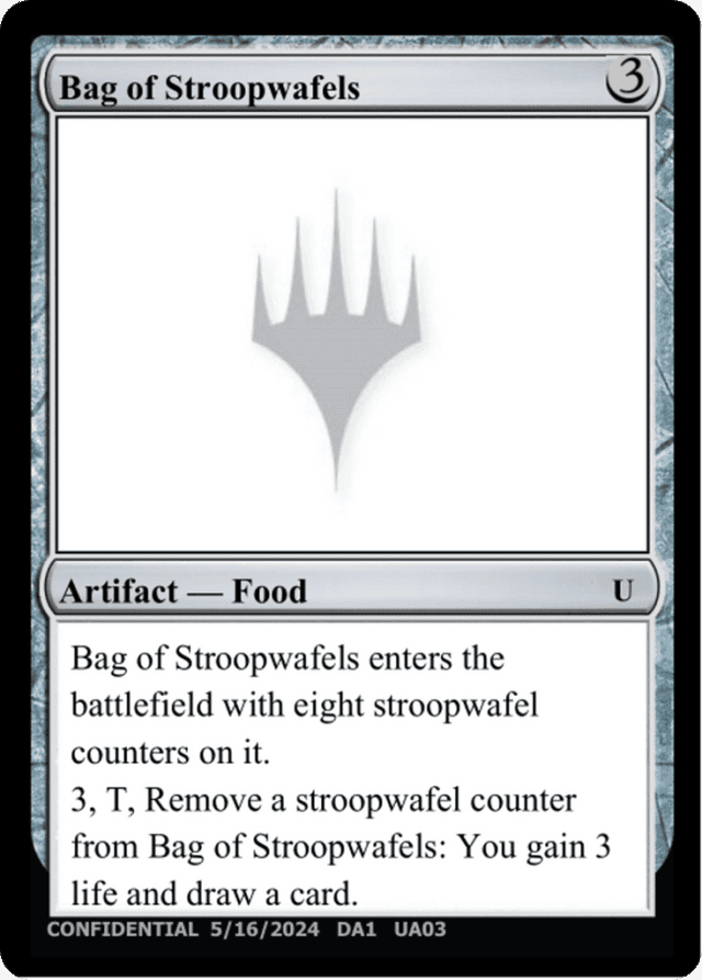 Bag of Stroopwafels enters the battlefield with eight stroopwafel counters on it. {3}, {T}, Remove a stroopwafel counter from Bag of Stroopwafels: You gain 3 life and draw a card.