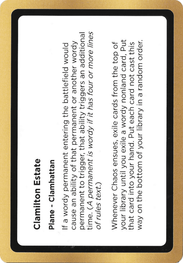 If a wordy permanent entering the battlefield would cause an ability of that permanent or another wordy permanent to trigger, that ability triggers an additional time. (A permanent is wordy if it has four or more lines of rules text.) Whenever Chaos ensues, exile cards from the top of your library until you exile a wordy nonland card, Put that card into your hand. Put each card not cast this way on the bottom of your library in a random order.