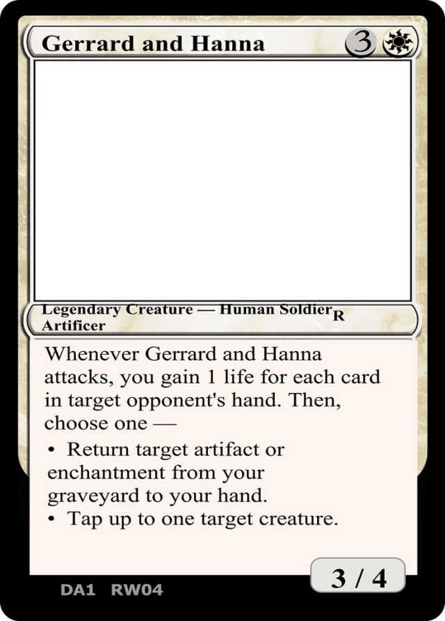 Whenever Gerrard and Hanna attacks, you gain 1 life for each card in target opponent's hand. Then, choose one — • Return target artifact or enchantment card from your graveyard to your hand. • Tap up to one target creature.