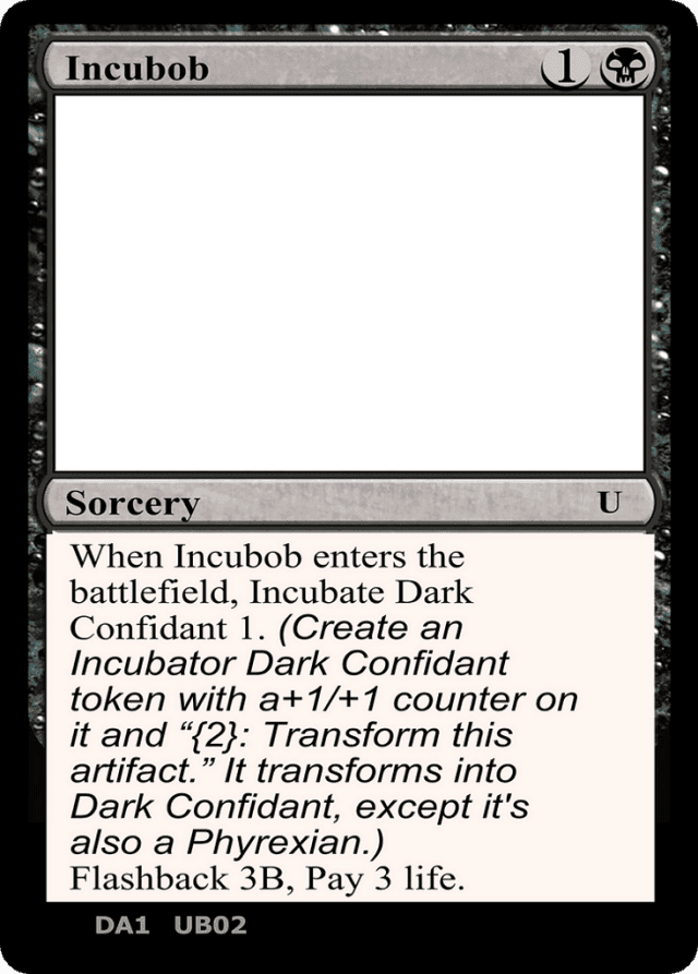Incubate Dark Confidant 1. (Create an Incubator Dark Confidant token with a +1/+1 counter on it and "{2}: Transform this artifact." It transforms into Dark Confidant, except it's also a Phyrexian.) Flashback {3}{B}, Pay 3 life.
