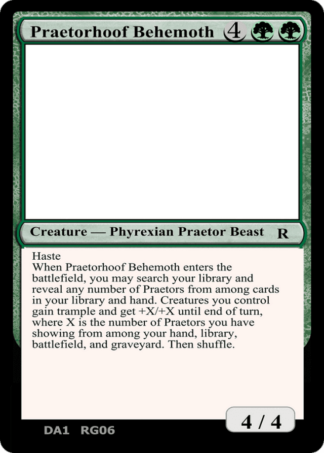 Haste When Praetorhoof Behemoth enters the battlefield, you may search your library and reveal any number of Praetors from among cards in your library and hand. Creatures you control gain trample and get +X/+X until end of turn, where X is the number of Praetors you have showing from among your hand, library, battlefield, and graveyard. Then shuffle.