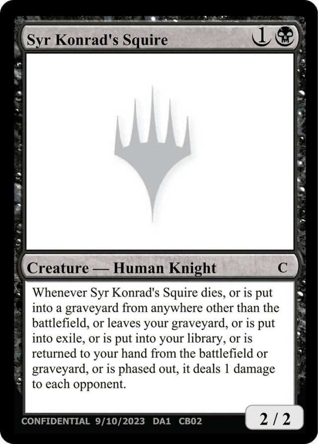 Whenever Syr Konrad's Squire dies, or is put into a graveyard from anywhere other than the battlefield, or leaves your graveyard, or is put into exile, or is put into your library, or is returned to your hand from the battlefield or graveyard, or is phased out, it deals 1 damage to each opponent.