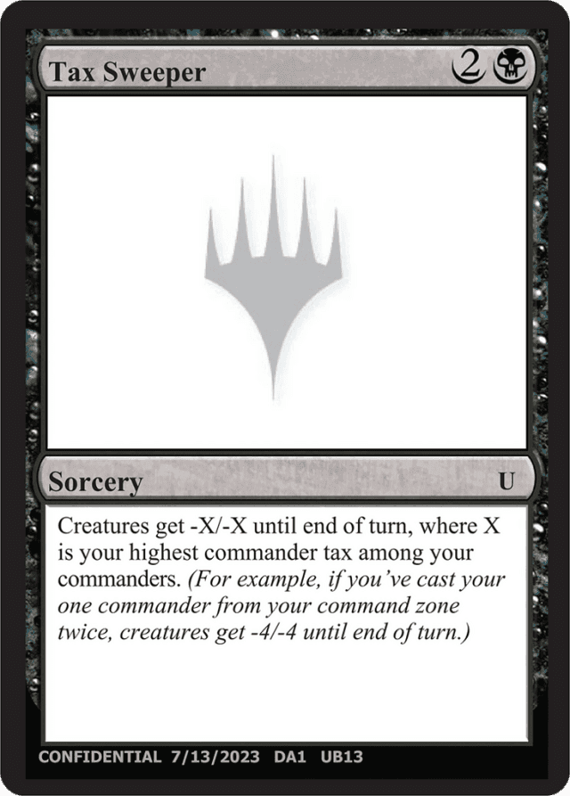 Creatures get -X/-X until end of turn, where X is your highest commander tax among your commanders. (For example, if you've cast your one commander from your command zone twice, creatures get -4/-4 until end of turn.)