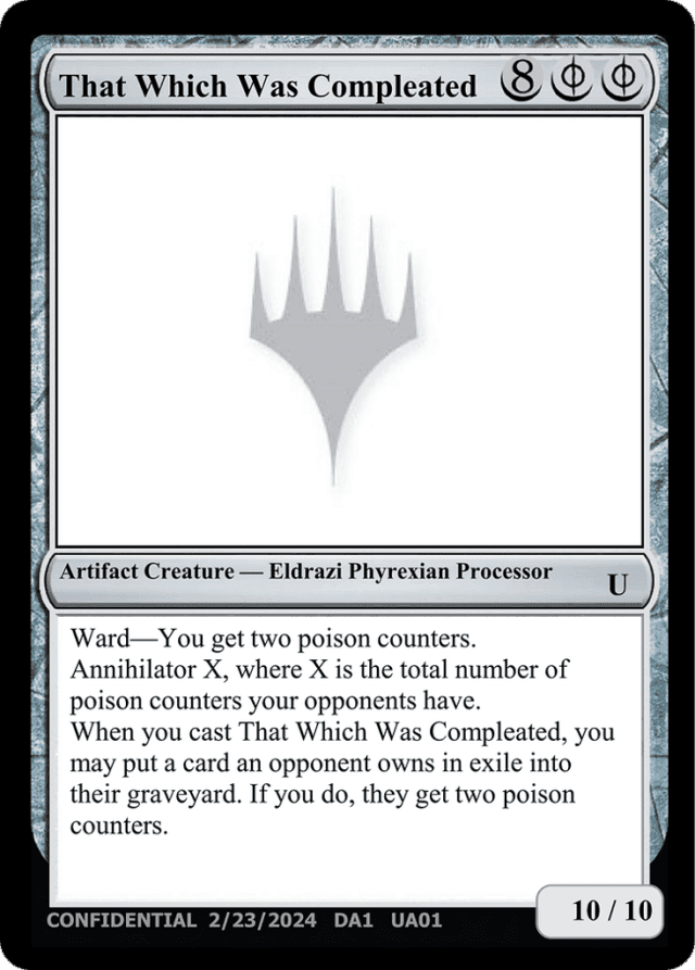 Ward—You get two poison counters. Annihilator X, where X is the total number of poison counters your opponents have. When you cast That Which Was Compleated, you may put a card an opponent owns in exile into their graveyard. If you do, they get two poison counters.