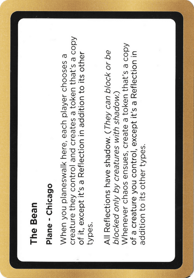 When you planeswalk here, each player chooses a creature they control and creates a token that's a copy of it, except it's a Reflection in addition to its other types. All Reflections have shadow. (They can block or be blocked only by creatures with shadow.) Whenever chaos ensues, create a token that's a copy of a creature you control, except it's a Reflection in addition to its other types.