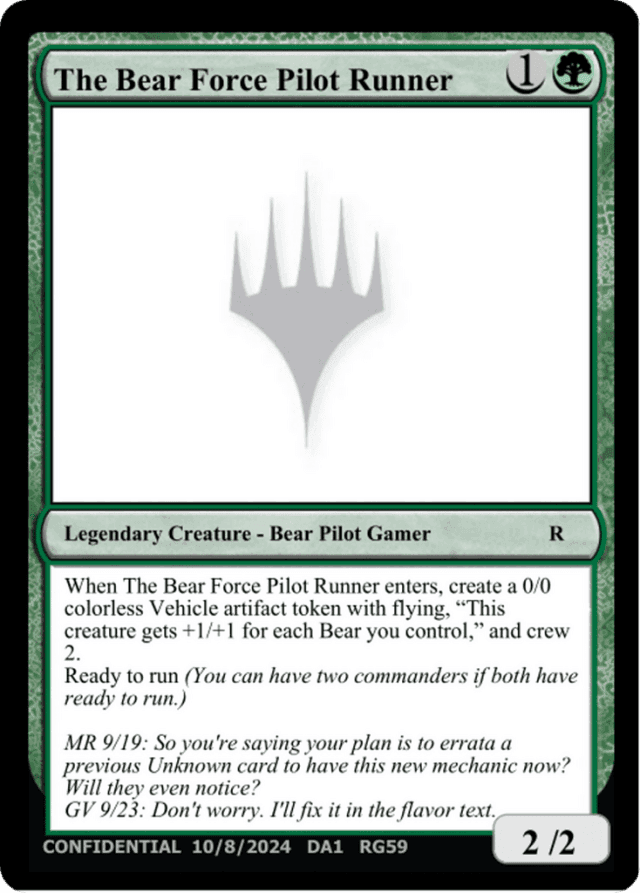 When The Bear Force Pilot Runner enters, create a 0/0 colorless Vehicle artifact token with flying, "This creature gets +1/+1 for each Bear you control," and crew 2. Ready to run (You can have two commanders if both have ready to run.)