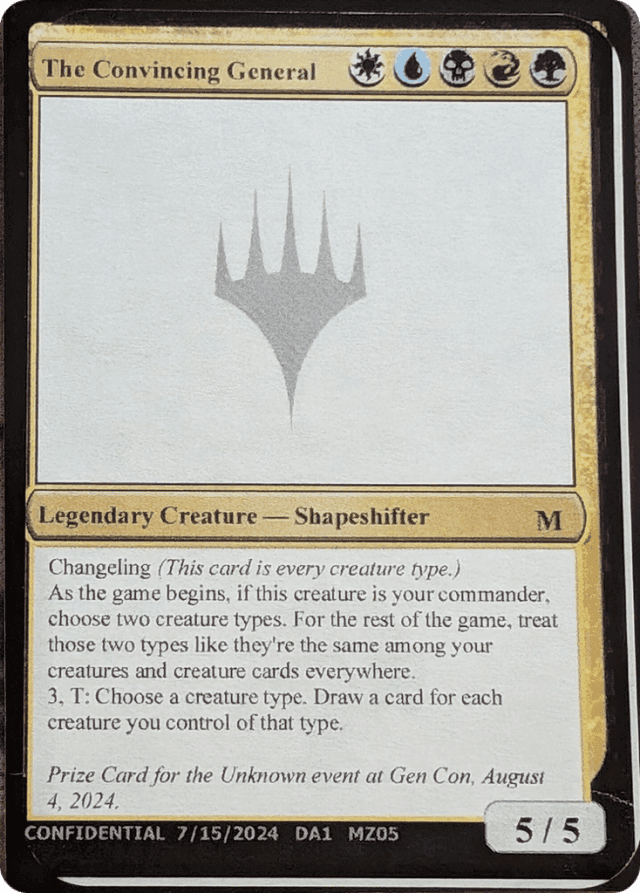 Changeling (This card is every creature type.) As the game begins, if this creature is your commander, choose two creature types. For the rest of the game, treat those two types like they're the same among your creatures and creature cards everywhere. {3}, {T}: Choose a creature type. Draw a card for each creature you control of that type.