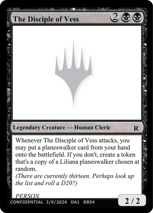 Whenever The Disciple of Vess attacks, you may put a planeswalker card from your hand onto the battlefield. If you don't, create a token that's a copy of a Liliana planeswalker chosen at random. (There are currently thirteen. Perhaps look up the list and roll a D20?)