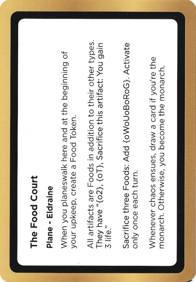 Artifacts are Foods in addition to their other types (They have "{2}, {T}, Sacrifice this artifact: You gain 3 life.") Sacrifice three Foods: Add {W}{U}{B}{R}{G}. Activate only once each turn and only during your turn. Chaos: You become the Monarch. If you are already the Monarch, draw a card.