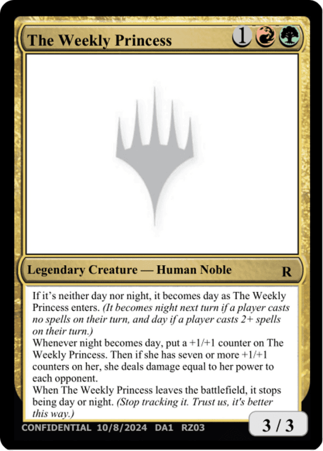 If it's neither day nor night, it becomes day as The Weekly Princess enters. (It becomes night next turn if a player casts no spells on their turn, and day if a player casts 2+ spells on their turn.) Whenever night becomes day, put a +1/+1 counter on The Weekly Princess. Then if she has seven or more +1/+1 counters on her, she deals damage equal to her power to each opponent. When The Weekly Princess leaves the battlefield, it stops being day or night. (Stop tracking it. Trust us, it's better this way.)