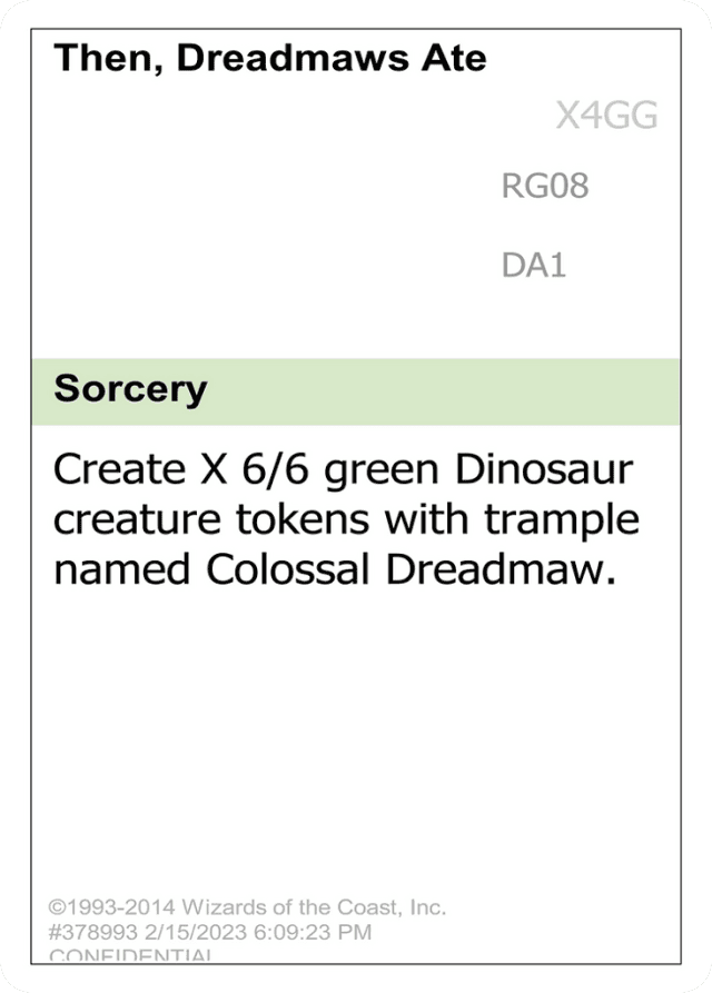 Create X 6/6 green Dinosaur creature tokens with trample named Colossal Dreadmaw.