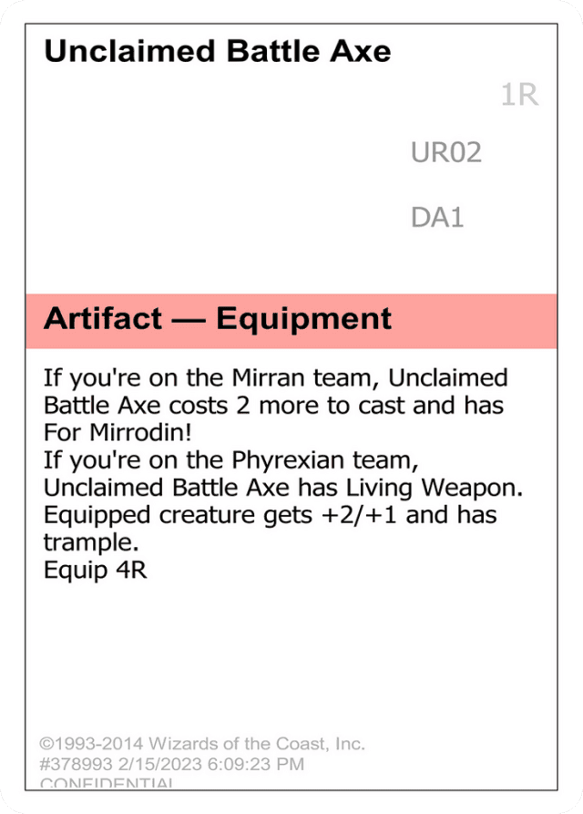 If you're on the Mirran team, Unclaimed Battle Axe costs {2} more to cast and has For Mirrodin! If you're on the Phyrexian team, Unclaimed Battle Axe has Living Weapon. Equipped creature gets +2/+1 and has trample. Equip {4}{R}