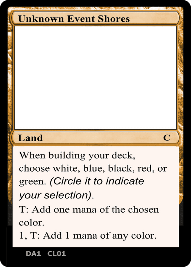 When building your deck, choose white, blue, black, red, or green (Circle it to indicate your selection.) {T}: Add one mana of the chosen color. {1}, {T}: Add 1 mana of any color.
