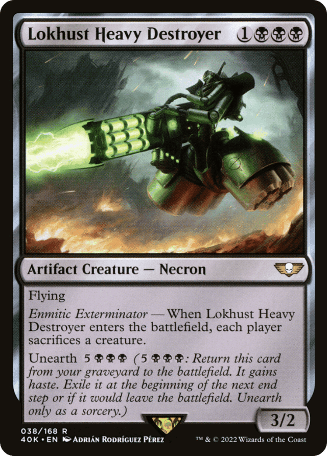 Activating a permanent card's unearth ability isn't the same as casting it as a spell. The unearth ability is put on the stack, but the card is not. Spells and abilities that interact with activated abilities (such as Stifle) will interact with unearth, but spells and abilities that interact with spells (such as Cancel) will not. — As Lokhust Heavy Destroyer's triggered ability resolves, first the player whose turn it is chooses a creature to sacrifice, then each other player in turn order does the same knowing the choices made before them. Then all those creatures are sacrificed simultaneously. — At the beginning of the end step, a permanent returned to the battlefield with unearth is exiled. This is a delayed triggered ability, and it can be countered by effects that counter triggered abilities. If the ability is countered, the permanent will stay on the battlefield and the delayed trigger won't trigger again. However, the replacement effect will still exile it if it eventually leaves the battlefield. — If a permanent returned to the battlefield by an unearth ability would leave it for any reason, it's exiled instead—unless the spell or ability that's causing it to leave the battlefield is actually trying to exile it. In that case, the spell or ability succeeds at exiling the permanent. If the spell or ability later returns the card to the battlefield, it will return as a new object with no relation to its previous existence. The unearth effect will no longer apply to it. — If you activate a card's unearth ability but that card is removed from your graveyard before the ability resolves, that unearth ability will resolve and do nothing. — Unearth grants haste to the permanent that's returned to the battlefield. However, neither of the "exile" abilities is granted to that permanent. If that creature loses all its abilities, it will still be exiled at the beginning of the end step, and if it would leave the battlefield, it is still exiled instead. — When its triggered ability resolves, you may sacrifice Lokhust Heavy Destroyer itself. If you control no other creatures, you'll have to sacrifice it. If it was unearthed, it will be exiled.