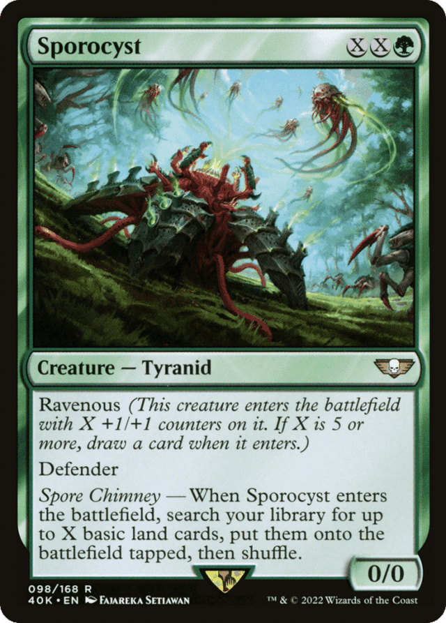 Ravenous (This creature enters with X +1/+1 counters on it. If X is 5 or more, draw a card when it enters.) Defender Spore Chimney — When this creature enters, search your library for up to X basic land cards, put them onto the battlefield tapped, then shuffle.