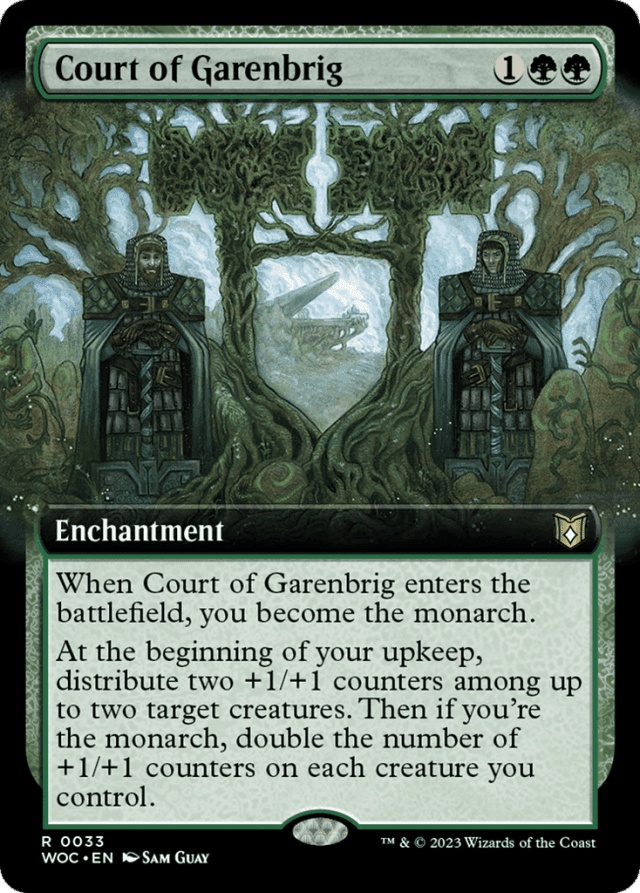 If combat damage dealt to the monarch causes that player to lose the game, the triggered ability that causes the controller of the attacking creature to become the monarch doesn't resolve. In most cases, the controller of the attacking creature will still become the monarch as it is likely their turn. — If some of the creatures are illegal targets as Court of Garenbrig's last ability tries to resolve, the original distribution of counters still applies and the counters that would have been put on illegal targets are lost. — If the monarch leaves the game during another player's turn, that player becomes the monarch. If the monarch leaves the game during their turn, the next player in turn order becomes the monarch. — If the triggered ability that causes the monarch to draw a card goes on the stack and a different player becomes the monarch before that ability resolves, the first player will still draw the card. — The game starts with no monarch. As a player becomes the monarch, the current monarch (if any) ceases being the monarch. There is never more than one monarch at a time. — There are two inherent triggered abilities associated with being the monarch. These triggered abilities have no source and are controlled by the player who was the monarch at the time the abilities triggered. The full texts of these abilities are "At the beginning of the monarch's end step, that player draws a card" and "Whenever a creature deals combat damage to the monarch, its controller becomes the monarch." — To double the number of +1/+1 counters on a permanent, put a number of +1/+1 counters on it equal to the number it already has. Other cards that interact with putting counters on it will interact with this effect accordingly. — You choose how the counters will be distributed as you put Court of Garenbrig's last ability on the stack. Each target must receive at least one +1/+1 counter.