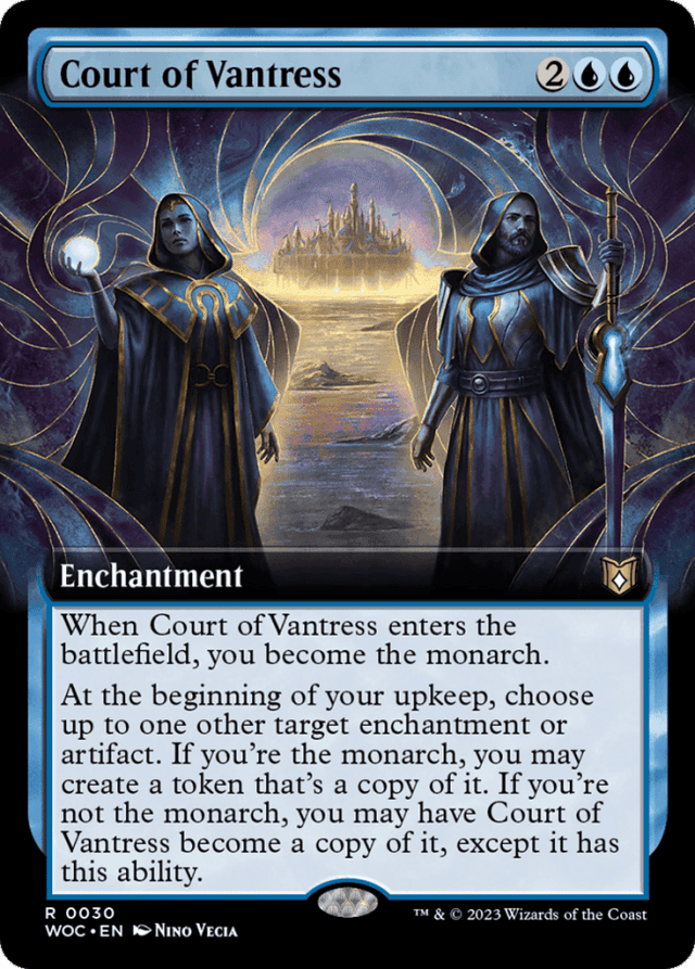 Any enters-the-battlefield abilities of the copied permanent will trigger when the token enters the battlefield. Any "as [this permanent] enters the battlefield" or "[this permanent] enters the battlefield with" abilities of the permanent will also work. — Court of Vantress copies the printed values of the enchantment or artifact plus any copy effects that have been applied to it. — If Court of Vantress becomes a copy of a token, it copies the original characteristics of that token as defined by the effect that put it onto the battlefield. It won't become a token. — If Court of Vantress becomes a copy of an Aura, it's put into its owner's graveyard unless it's somehow attached to an appropriate object or player already. If it becomes a copy of an Equipment and is attached to a creature, it'll become unattached when it becomes a non-Equipment, non-Aura permanent. — If another permanent becomes a copy of Court of Vantress, it will become a copy of whatever Court of Vantress is currently copying (if anything) that also has Court of Vantress's last ability. — If combat damage dealt to the monarch causes that player to lose the game, the triggered ability that causes the controller of the attacking creature to become the monarch doesn't resolve. In most cases, the controller of the attacking creature will still become the monarch as it is likely their turn. — If the copied permanent has {X} in its mana cost, X is 0. — If the copied permanent is copying something else, then the token enters the battlefield as whatever that permanent copied, with the stated exceptions. — If the monarch leaves the game during another player's turn, that player becomes the monarch. If the monarch leaves the game during their turn, the next player in turn order becomes the monarch. — If the triggered ability that causes the monarch to draw a card goes on the stack and a different player becomes the monarch before that ability resolves, the first player will still draw the card. — The copy effect lasts indefinitely. Often, it will last until it is overwritten by another copy effect (if it copies another permanent on a future turn, perhaps). — The game starts with no monarch. As a player becomes the monarch, the current monarch (if any) ceases being the monarch. There is never more than one monarch at a time. — The token copies exactly what was printed on the original permanent and nothing else (unless that permanent is itself copying something else; see below). It doesn't copy whether that permanent is tapped or untapped, whether it has any counters on it or Auras attached to it, or any non-copy effects that have changed its power, toughness, types, color, and so on. — There are two inherent triggered abilities associated with being the monarch. These triggered abilities have no source and are controlled by the player who was the monarch at the time the abilities triggered. The full texts of these abilities are "At the beginning of the monarch's end step, that player draws a card" and "Whenever a creature deals combat damage to the monarch, its controller becomes the monarch." — When Court of Vantress becomes a copy of a permanent, it's neither entering nor leaving the battlefield. Any enters-the-battlefield or leaves-the-battlefield abilities won't trigger.
