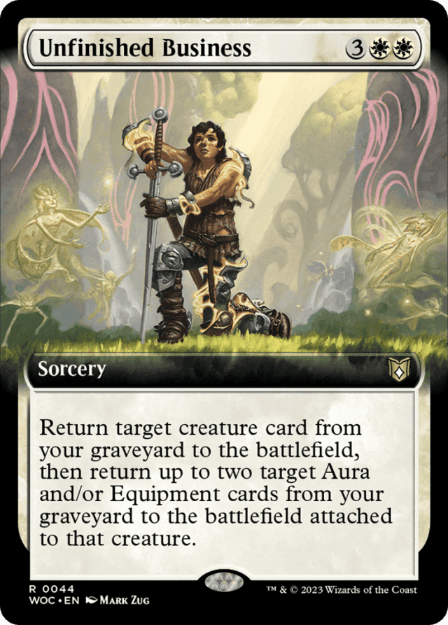 Return target creature card from your graveyard to the battlefield, then return up to two target Aura and/or Equipment cards from your graveyard to the battlefield attached to that creature. (If the Auras can't enchant that creature, they remain in your graveyard.)