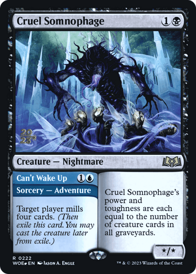 An adventurer card is a permanent card in every zone except the stack, as well as while on the stack if not cast as an Adventure. Ignore its alternative characteristics in those cases. For example, while it's in your graveyard, Questing Druid is a green creature card whose mana value is 2. It can't be the target of Tenacious Tomeseeker's triggered ability ("return target instant or sorcery card from your graveyard to your hand"). — An effect may refer to a card, spell, or permanent that "has an Adventure." This refers to a card, spell, or permanent that has an adventurer card's set of alternative characteristics, even if they're not being used and even if that card was never cast as an Adventure. — Casting a card as an Adventure isn't casting it for an alternative cost. Effects that allow you to cast a spell for an alternative cost or without paying its mana cost may allow you to apply those to the Adventure. — If a spell is cast as an Adventure, its controller exiles it instead of putting it into its owner's graveyard as it resolves. For as long as it remains exiled, that player may cast it as a permanent spell. If an Adventure spell leaves the stack in any way other than resolving (most likely by being countered or by failing to resolve because its targets have all become illegal), that card won't be exiled and the spell's controller won't be able to cast it as a permanent later. — If an adventurer card ends up in exile for any other reason than by exiling itself while resolving, it won't give you permission to cast it as a permanent spell. — If an effect copies an Adventure spell, that copy is exiled as it resolves. It ceases to exist as a state-based action; it's not possible to cast the copy as a permanent. — If an effect instructs you to choose a card name, you may choose the alternative Adventure name. Consider only the alternative characteristics to determine whether that is an appropriate name to choose. — If an effect refers to a card, spell, or permanent that has an Adventure, it won't find an instant or sorcery spell on the stack that's been cast as an Adventure. — If an object becomes a copy of an object that has an Adventure, the copy also has an Adventure. If it changes zones, it will either cease to exist (if it's a token) or cease to be a copy (if it's a nontoken permanent), and so you won't be able to cast it as an Adventure. — If you cast an adventurer card as an Adventure, use only its alternative characteristics to determine whether it's legal to cast that spell. For example, if you control Johann, Apprentice Sorcerer ("Once each turn, you may cast an instant or sorcery spell from the top of your library.") and Questing Druid is on top of your library, you can cast Seek the Beast, but not Questing Druid. — The ability that defines Cruel Somnophage's power and toughness functions in all zones, not just the battlefield. — When casting a spell as an Adventure, use the alternative characteristics and ignore all of the card's normal characteristics. The spell's color, mana cost, mana value, and so on are determined by only those alternative characteristics. If the spell leaves the stack, it immediately resumes using its normal characteristics. — You must still follow any timing restrictions and permissions for the permanent spell you cast from exile. Normally, you'll be able to cast it only during your main phase while the stack is empty.