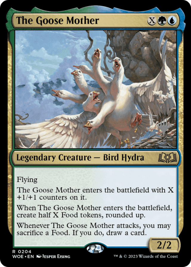 Flying The Goose Mother enters with X +1/+1 counters on it. When The Goose Mother enters, create half X Food tokens, rounded up. Whenever The Goose Mother attacks, you may sacrifice a Food. If you do, draw a card.