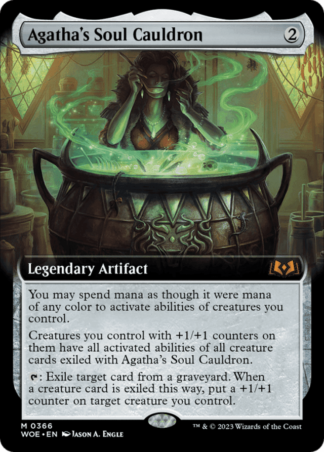 You may spend mana as though it were mana of any color to activate abilities of creatures you control. Creatures you control with +1/+1 counters on them have all activated abilities of all creature cards exiled with Agatha's Soul Cauldron. {T}: Exile target card from a graveyard. When a creature card is exiled this way, put a +1/+1 counter on target creature you control.