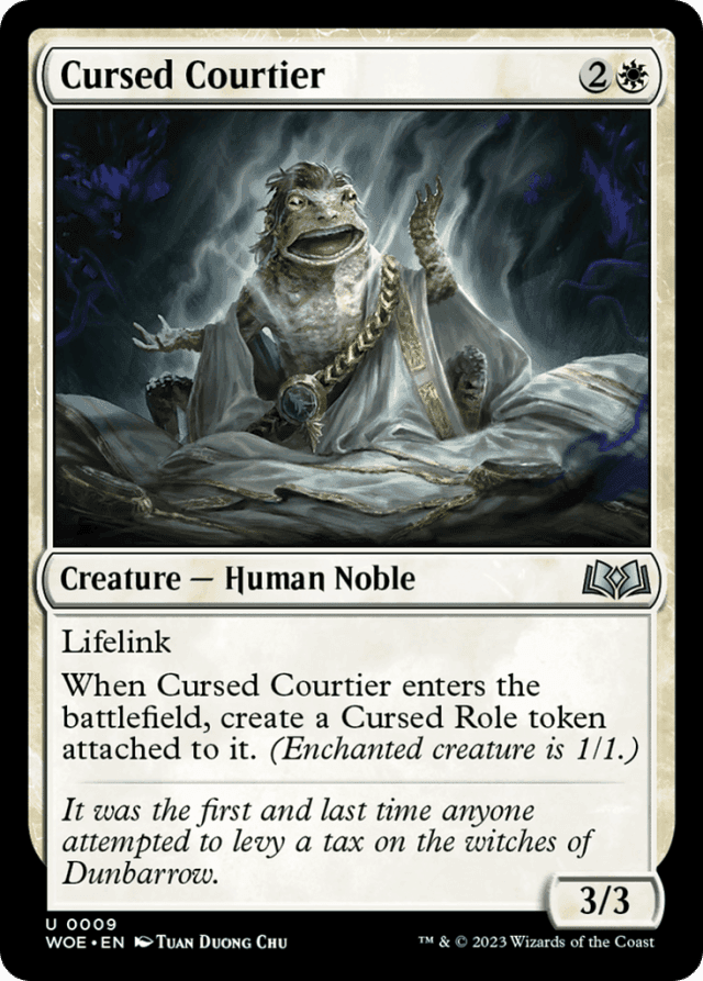 A permanent can have multiple Roles attached to it if each one is controlled by a different player. — Cards in the Wilds of Eldraine main set create six different Role tokens: Cursed, Monster, Royal, Sorcerer, Wicked, and Young Hero. A seventh Role token, Virtuous, is created by Ellivere of the Wild Court, the commander of the “Virtue and Valor” Commander Deck. — Hexproof and shroud won’t prevent a Role from becoming attached to a permanent if the ability creating that Role attached to that permanent doesn’t target it. — If a permanent has more than one Role attached to it controlled by the same player, each of those Roles except the one with the most recent timestamp is put into its owner’s graveyard. This is a state-based action. — If two or more Roles controlled by the same player become attached to a permanent at the same time (perhaps due to an effect such as that of Doubling Season), that player chooses which one to keep and which are put into their owners’ graveyards. — In rare cases, a spell or ability might attempt to create a Role token enchanting a permanent that it can’t legally enchant (because of an ability like protection from enchantments). In such cases, the Role token isn’t created. — Roles are colorless enchantment tokens. Each one has the Aura and Role subtypes and the enchant creature ability. — Some spells and abilities that create Role tokens require targets. If each target chosen is an illegal target as that spell or ability tries to resolve, it won’t resolve. The Role token won’t be created.