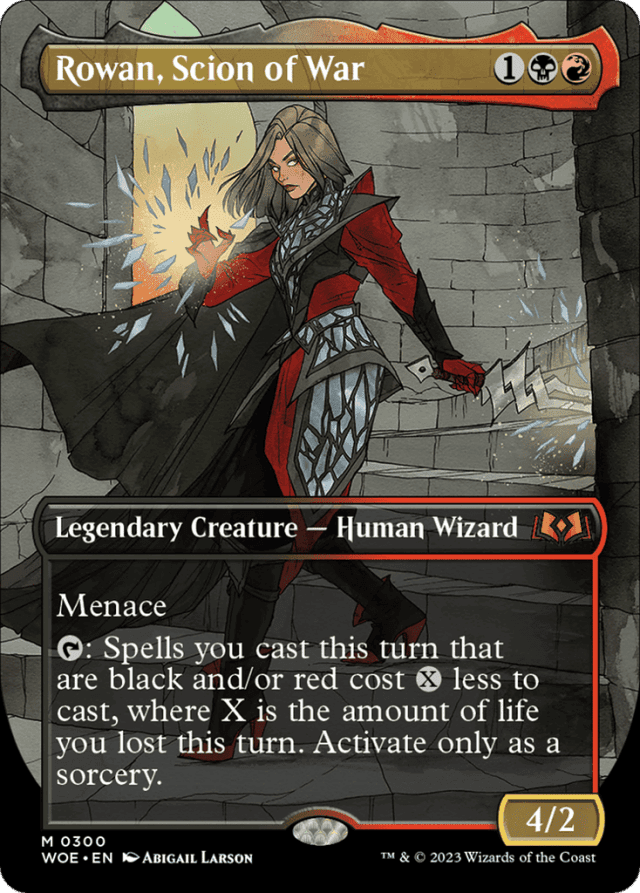 Rowan's activated ability can't reduce the amount of colored mana you pay for a spell. It reduces only the generic mana component of that cost. — Rowan's activated ability counts the total amount of life you lost without taking into account any life you gained during that turn. For example, if you gained 3 life and lost 3 life earlier in the turn, the cost of black and/or red spells you cast this turn will be reduced by {3}. — Rowan's activated ability doesn't change the mana cost or mana value of any spell. It changes only the total cost you pay. — The value of X is determined only once, at the time Rowan, Scion of War's activated ability resolves.