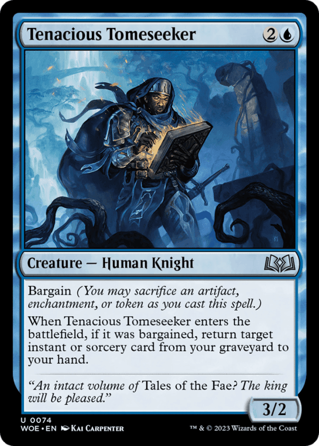 Adventurer cards aren't instant or sorcery cards while they're in your graveyard. You can't use Tenacious Tomeseeker's ability to return an adventurer card from your graveyard to your hand. — Bargain means “As an additional cost to cast this spell, you may sacrifice an artifact, enchantment, or token.” — Bargain represents an optional additional cost. A spell cast with that additional cost paid is “bargained.” — If you copy a bargained spell, the copy is also bargained. If a card or token enters the battlefield as a copy of a permanent that’s already on the battlefield, the new permanent isn’t bargained, even if the original was. — Some instant and sorcery spells require additional targets if they’re bargained. You ignore those targeting requirements if those spells aren’t bargained, and you can’t bargain those spells unless you can choose the appropriate targets. On the other hand, you can bargain a permanent spell even if you won’t be able to choose targets for an enters-the-battlefield ability of that permanent once the spell resolves. — You may sacrifice only one artifact, enchantment, or token to pay a spell’s bargain cost.