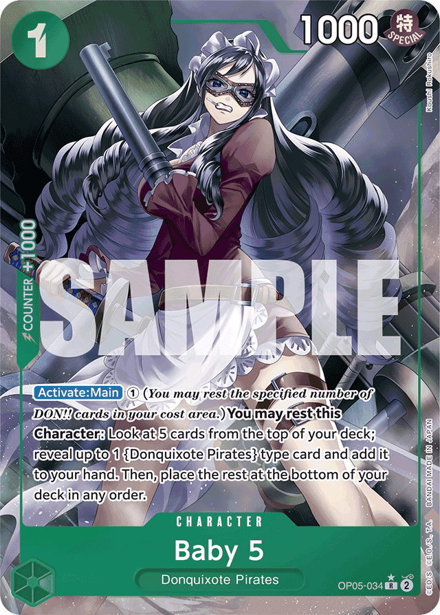 [Activate: Main] ➀ (You may rest the specified number of DON!! cards in your cost area.) You may rest this Character: Look at 5 cards from the top of your deck; reveal up to 1 {Donquixote Pirates} type card and add it to your hand. Then, place the rest at the bottom of your deck in any order.
