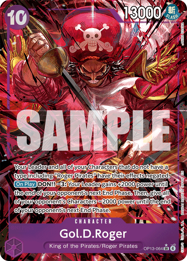 Your Leader and all of your Characters that do not have a type including "Roger Pirates" have their effects negated. [On Play] DON!! −3: Your Leader gains +2000 power until the end of your opponent's next End Phase. Then, give all of your opponent's Characters −2000 power until the end of your opponent's next End Phase.