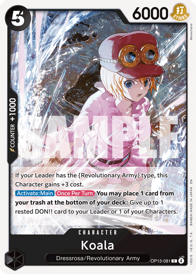 If your Leader has the {Revolutionary Army} type, this Character gains +3 cost. [Activate: Main] [Once Per Turn] You may place 1 card from your trash at the bottom of your deck: Give up to 1 rested DON!! card to your Leader or 1 of your Characters.