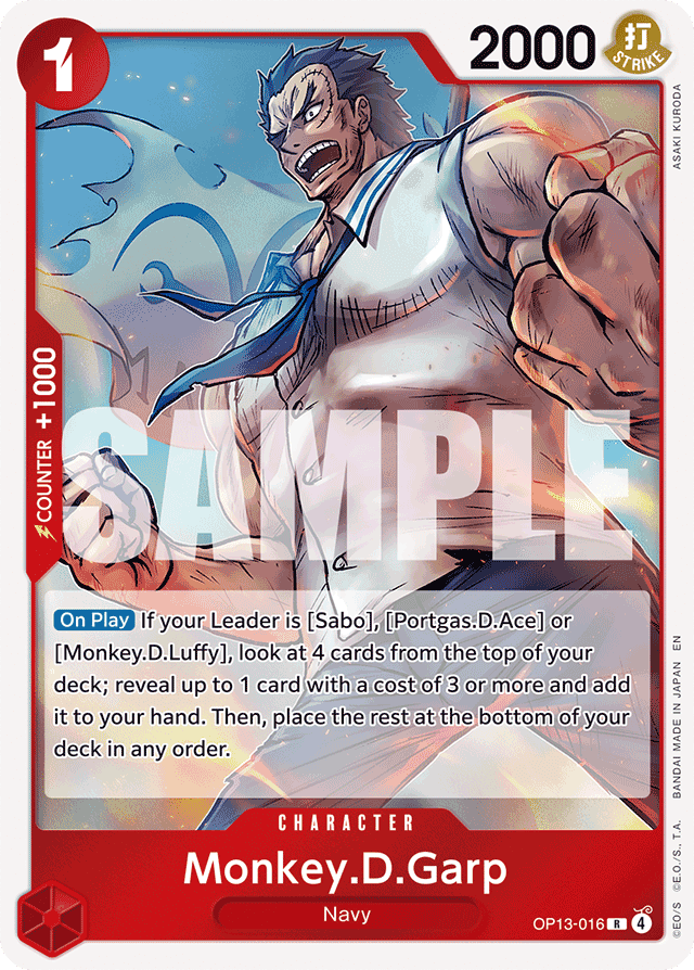 [On Play] If your Leader is [Sabo], [Portgas.D.Ace] or [Monkey.D.Luffy], look at 4 cards from the top of your deck; reveal up to 1 card with a cost of 3 or more and add it to your hand. Then, place the rest at the bottom of your deck in any order.