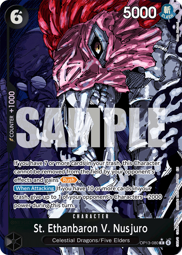 If you have 7 or more cards in your trash, this Character cannot be removed from the field by your opponent's effects and gains [Rush]. [When Attacking] If you have 10 or more cards in your trash, give up to 1 of your opponent's Characters −2000 power during this turn.
