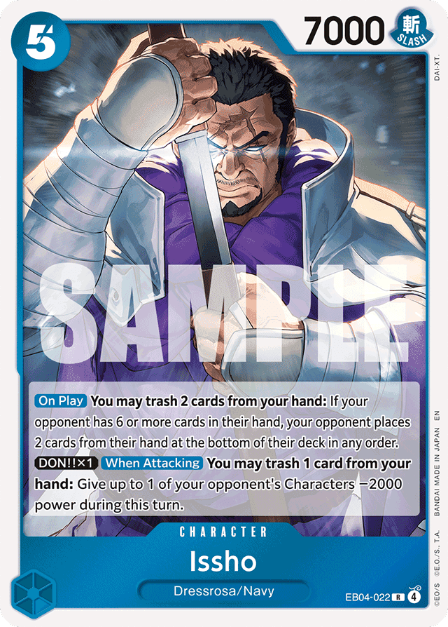 [On Play] You may trash 2 cards from your hand: If your opponent has 6 or more cards in their hand, your opponent places 2 cards from their hand at the bottom of their deck in any order. [DON!! x1] [When Attacking] You may trash 1 card from your hand: Give up to 1 of your opponent's Characters −2000 power during this turn.