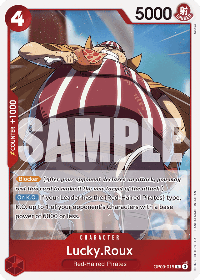[Blocker] (After your opponent declares an attack, you may rest this card to make it the new target of the attack.) [On K.O.] If your Leader has the {Red-Haired Pirates} type, K.O. up to 1 of your opponent's Characters with a base power of 6000 or less.