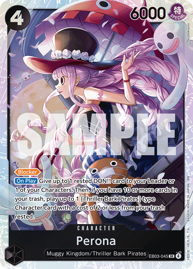 [Blocker] [On Play] Give up to 1 rested DON!! card to your Leader or 1 of your Characters. Then, if you have 10 or more cards in your trash, play up to 1 {Thriller Bark Pirates} type Character card with a cost of 2 or less from your trash rested.