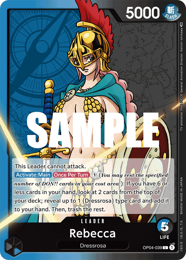 This Leader cannot attack. [Activate: Main] [Once Per Turn] ➀ (You may rest the specified number of DON!! cards in your cost area.): If you have 6 or less cards in your hand, look at 2 cards from the top of your deck; reveal up to 1 {Dressrosa} type card and add it to your hand. Then, trash the rest.