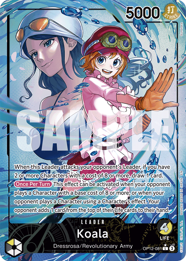 When this Leader attacks your opponent's Leader, if you have 2 or more Characters with a cost of 8 or more, draw 1 card. [Once Per Turn] This effect can be activated when your opponent plays a Character with a base cost of 8 or more, or when your opponent plays a Character using a Character's effect. Your opponent adds 1 card from the top of their Life cards to their hand.