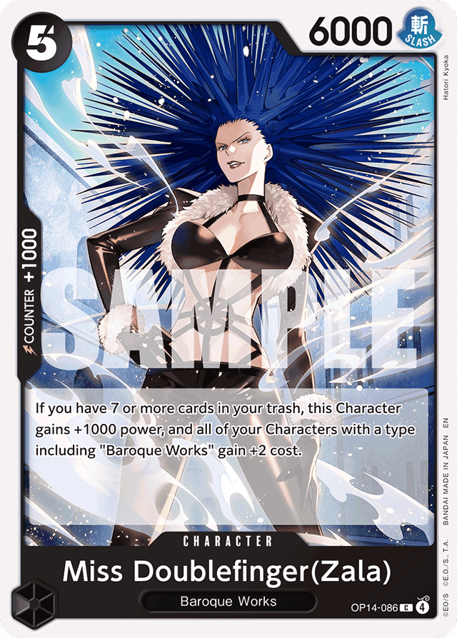 If you have 7 or more cards in your trash, this Character gains +1000 power, and all of your Characters with a type including "Baroque Works" gain +2 cost.